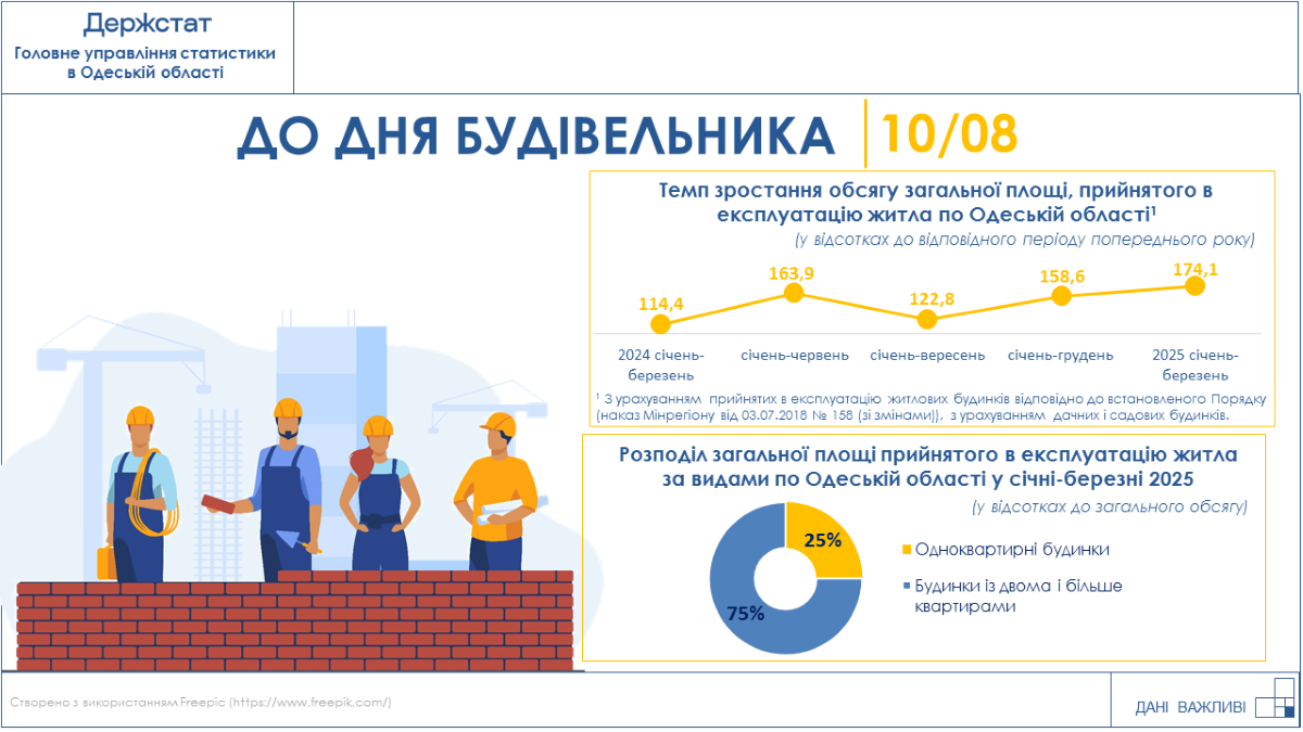 З нагоди свята будівельників аналітики оприлюднили показники будівельної активності в Одеській області за перший квартал 2025 року. Так, в регіоні за цей період прийняли в експлуатацію 199,3 тисячі квадратних метрів житла — це 8,7% від загального обсягу по країні. За цим показником область посідає 4 місце в Україні, поступаючись лише Київській області, столиці та Львівщині.