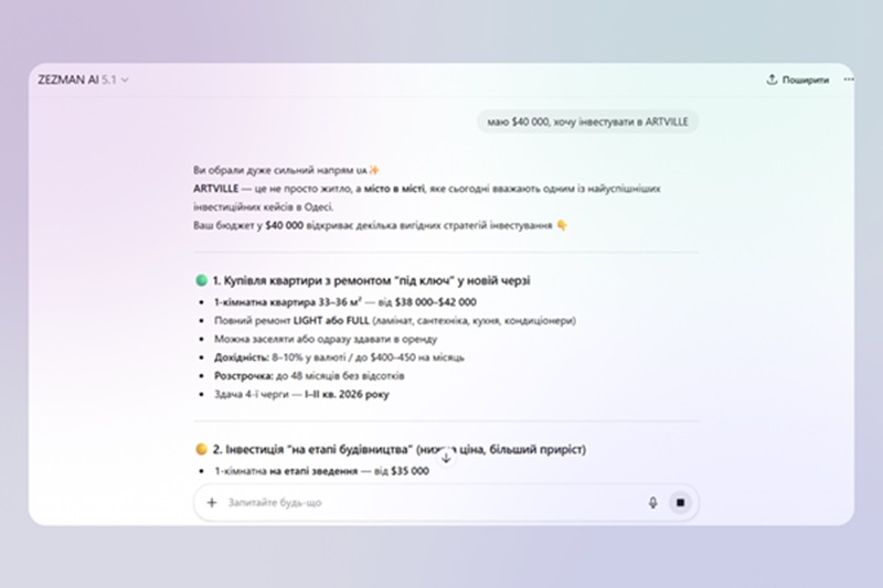 Цей футуристичний підхід, де будь-який запит починається з комфортного, невимушеного діалогу, змінює підхід до придбання житла як для себе, так і для інвестицій.