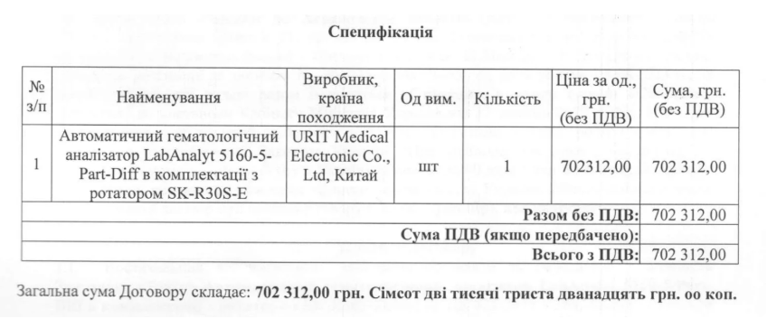 Згідно з даними Prozorro, ціна аналізатора ''LabAnalyt 5160-5-Part-Diff'' коливається від 588 до 690 тисяч гривень, а ротатора ''SK-R30S-E'' – від 7,2 до 11,4 тисячі гривень.