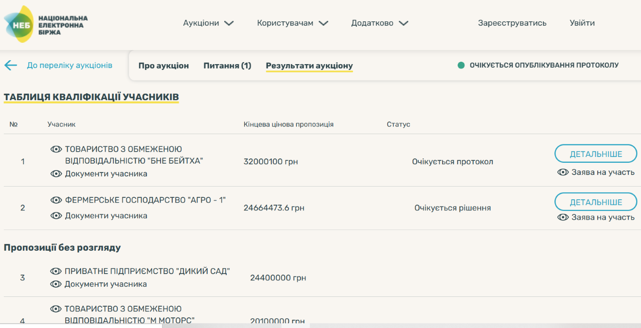 У торгах, що відбулися 11 вересня, брали участь 11 компаній та фізичних осіб. Серед пропозицій лідером стало ТОВ "Бне бейтха", яке запропонувало 32,1 мільйона гривень. Друге місце посіло ФГ "Агро-1" з 24,6 мільйонами, а третє приватне підприємство "Дикий сад" з пропозицією у 24,4 мільйона гривень. Інші учасники пропонували від 20,1 до 7 мільйонів гривень.