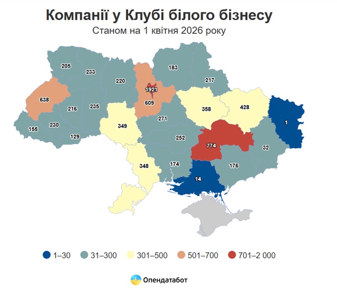 В цілому по Україні у Клубі на 18% більше компаній, ніж на кінець 2025 року. До Клубу можуть потрапити компанії та фопи, які демонструють відкритість, сумлінно сплачують податки, подають звітність та не мають зв'язку із росією.