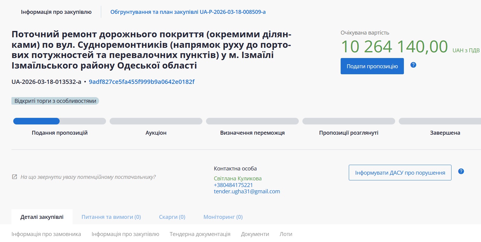 Управління житлово-комунального господарства Ізмаїльської міської ради оголосило відкриті торги з особливостями для пошуку підрядника для поточного ремонту дорожнього покриття по вулиці Судноремонтників в Ізмаїлі.