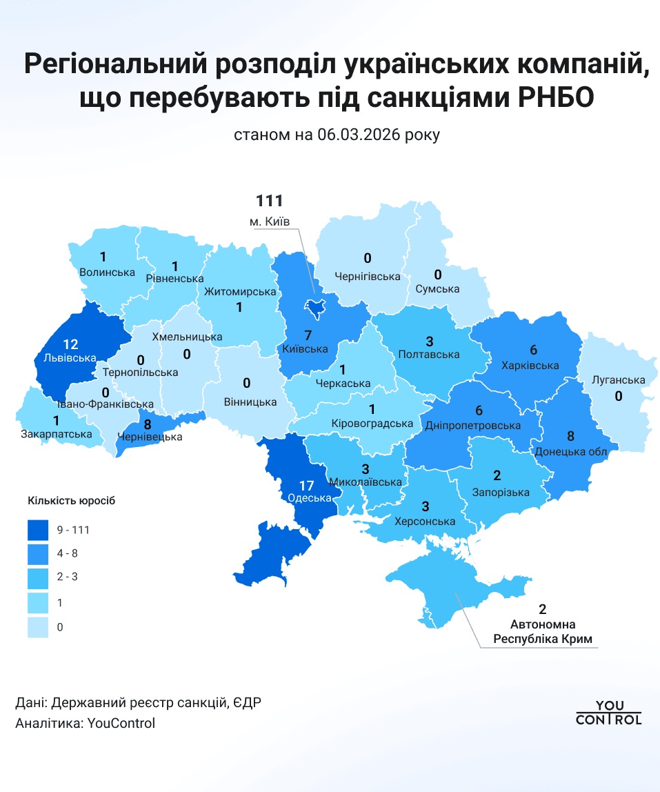 Аналітики R&D-центру YouControl встановили, що станом на березень 2026 року під санкціями Ради національної безпеки та оборони перебувають 8 тисяч 492 юридичні особи з 77 країн світу, а найбільше українських компаній проти яких запроваджені санкції, зареєстровані в Києві, Одеській і Львівській областях.