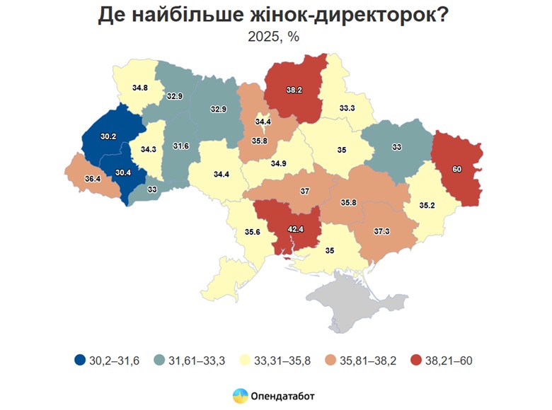 Натомість найменша частка жінок-директорок у Львівській (30%), Івано-Франківській (30%), Хмельницькій (32%), Житомирській та Рівненській областях (по 33%).