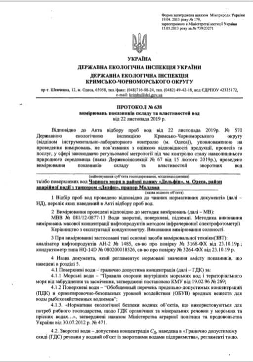 «Первый полноценный рабочий день, и сразу чрезвычайная ситуация. Сегодня у Одессы сел на мель танкер «Делфи» (под флагом Молдовы). В результате проверки, установлено превышение по содержанию в воде нефтепродуктов в 53 раза на месте аварии. Проводится постоянный мониторинг места загрязнения, государственные инспекторы находятся на месте происшествия. Представители Государственной экологической инспекции в соответствии с законом и процедурами рассчитают ущерб, нанесенный окружающей среде, с последующим обращением с претензией о возмещении причиненных убытков. Сейчас Государственными инспекторами по охране окружающей природной среды Крымско-Черноморского округа вместе с представителями АМПУ проводится повторное обследование места аварийного события и повторном отборе проб в связи с появлением пятен маслянистого состава»,- отметил чиновник.