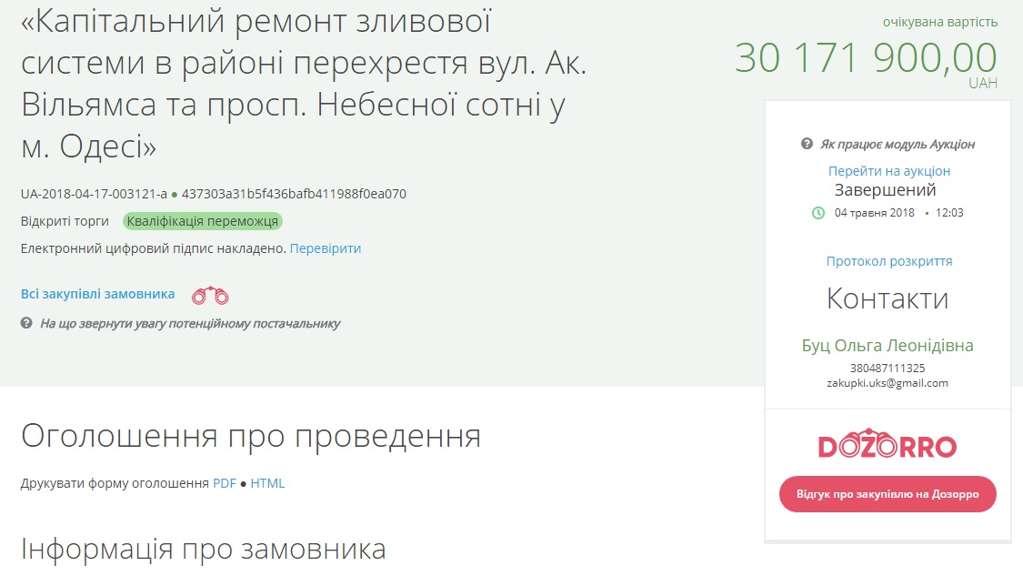 Управление капитального строительства Одесского городского совета провело тендер для определения компании, которая займется капитальным ремонтом ливневой системы в районе перекрестка улицы Академика Вильямса и проспекта Небесной сотни в Одессе.