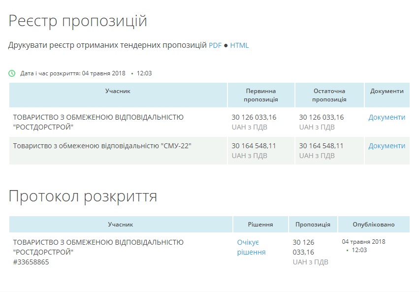 В результате предварительным победителем аукциона стала компания «Ростдорстрой», которая согласилась работать за 30 миллионов 126,03 тысячи гривень, что на 38 тысяч 515 гривень дешевле чем предложение конкурента.