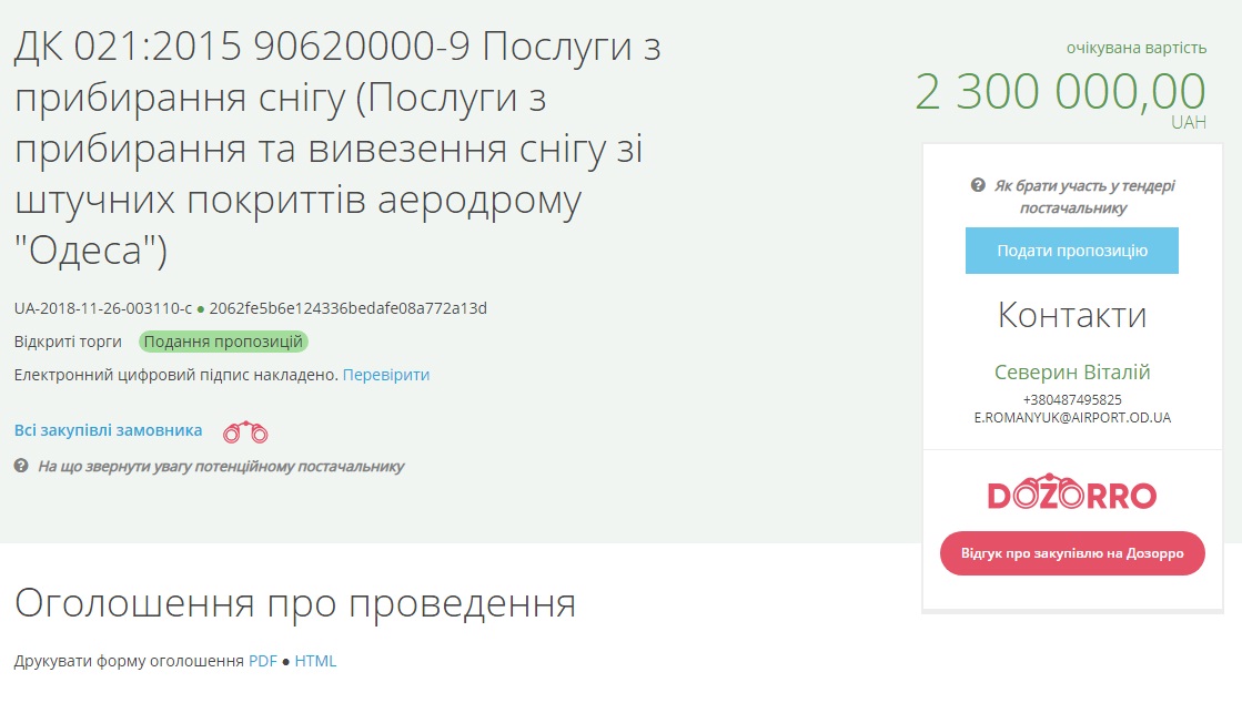 Аукцион должен состояться 12 декабря, а договор с компанией-победителем будет заключен на год, то есть до 31 декабря 2019 года. Ожидаемая стоимость закупки 2 миллиона 300 тысяч гривень.