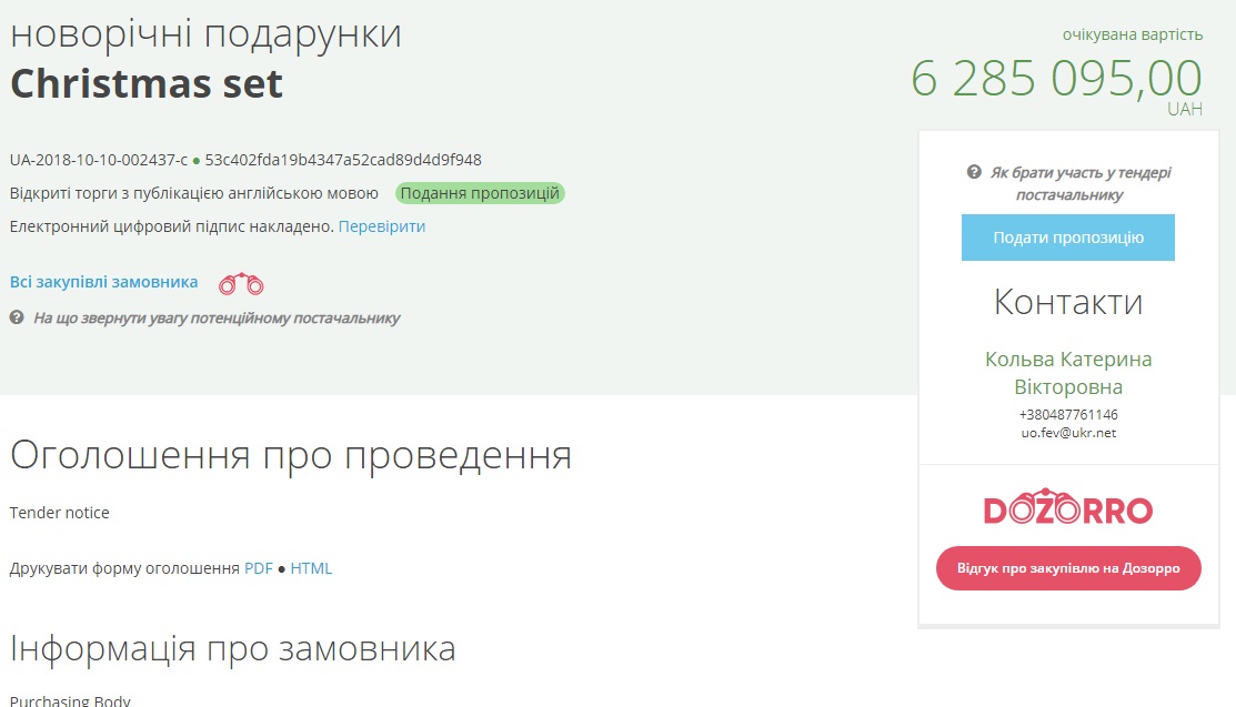 Ожидаемая стоимость закупки 6 миллионов 285 тысяч 95 гривень.  Наборы должны на 70% состоять из конфет, покрытых шоколадной или шоколадно-молочной глазурью. Начинка в этих конфетах должна быть как минимум пяти видов. Не более 20% подарочного набора должны приходиться на вафли или печенье и еще около 10% - на карамель или желейные конфеты.