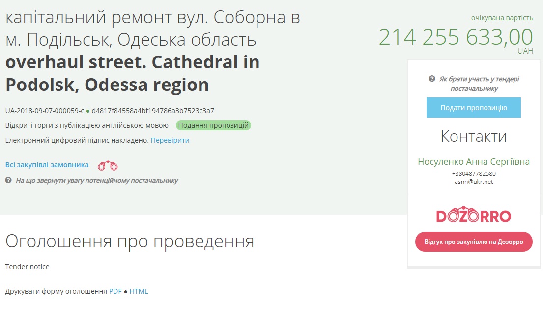 Согласно объявлению, аукцион состоится 13 сентября, а работу следует завершить до 31 декабря 2019 года. Ожидаемая стоимость закупки - 214 миллионов 255 тысяч 633 гривни.