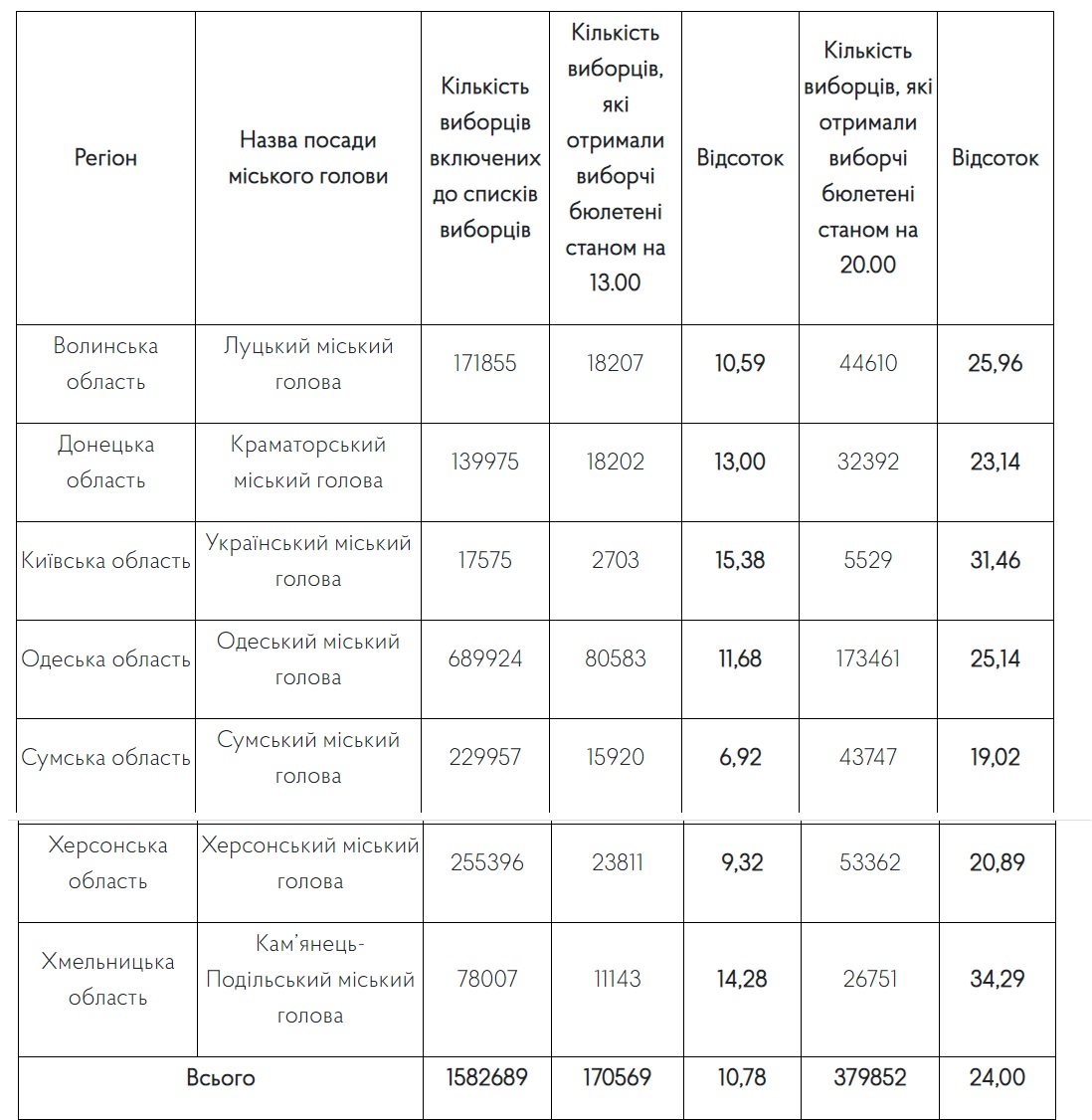 За повідомленнями усіх територіальних виборчих комісій, які здійснюють сьогодні підготовку та проведення повторного голосування з виборів міських голів, явка склала 24%.