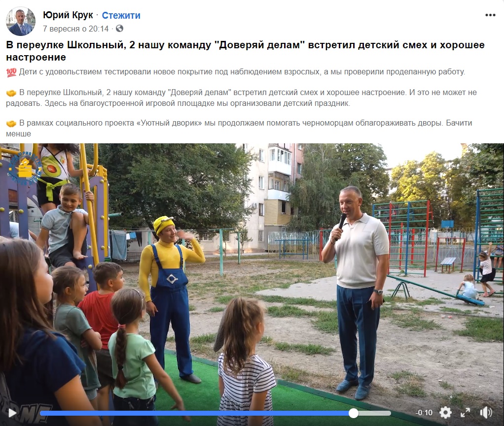 7 вересня на сторінці у Facebook депутата Одеської міської ради Юрія Крука оприлюднений допис про дитяче свято на дитячому майданчику у провулку Шкільному, 2 в м. Чорноморськ. У відеоролику одна з жительок міста стверджує, що благоустрій майданчику відбувся після звернення до Юрія Крука.