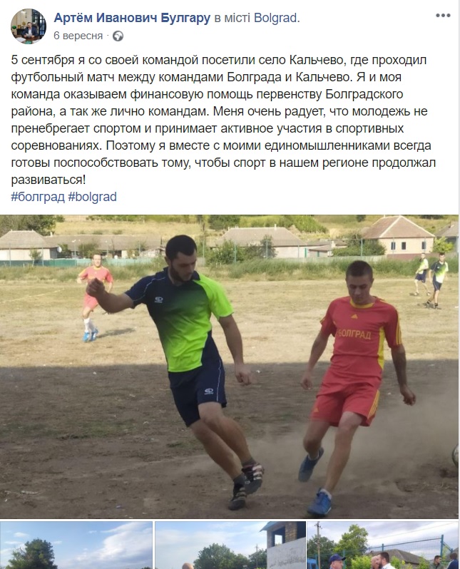 6 вересня на сторінці у Facebook громадського активіста Артема Булгару з’явилась публікація про те, що він з командою відвідав футбольний матч у селі Калчева. В публікації зазначено, що Артем Булгару і його команда надають фінансову допомогу першості Болградського району з футболу і командам зокрема.