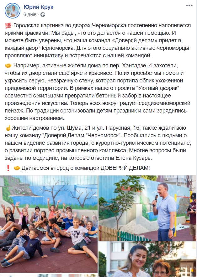 10 вересня на сторінці у Facebook депутата. Одеської міськради Юрія Крука був оприлюднений допис про дитяче свято у дворі будинку в провулку Хантадзе, 4 в м. Чорноморськ. В дописі зазначено, що командою партії «Довіряй Ділам» була надана допомога у прикрашенні стіни і організоване дитяче свято.