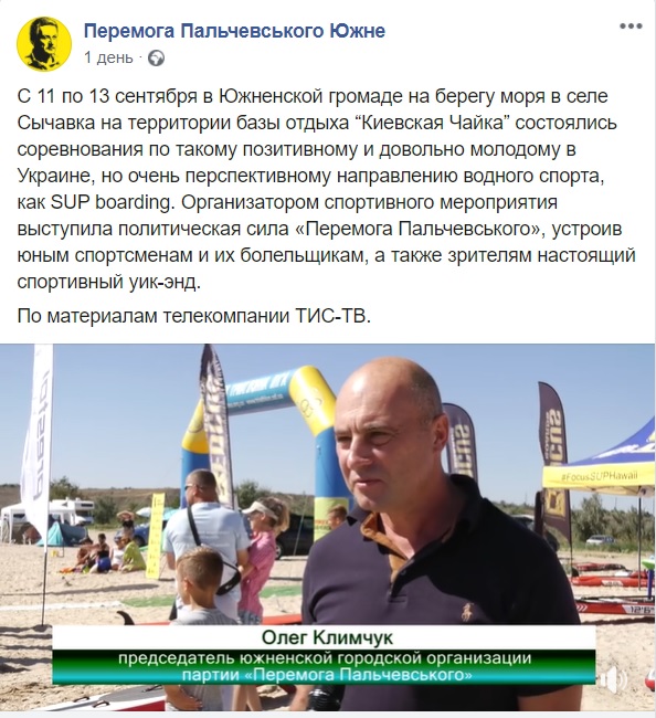 14 вересня на сторінці «Перемога Пальчевського Южне» у Facebook оприлюднили публікацію про змагання з SUP boarding, які відбулися 11-13 вересня. Як зазначено в публікації, організатором заходу була політична партія «Перемога Пальчевського». У відеоролику Олег Климчук, голова Южненської міської організації політичної партії «Перемога Пальчевського», зазначив, що партія виступила спонсором цього заходу.