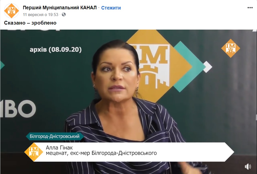 11 вересня на сторінці у Facebook Першого муніципального каналу оприлюднили відеосюжет, в якому колишня міська голова Алла Гінак подарувала 8 кисневих концентраторів Білгород-Дністровській міській лікарні.