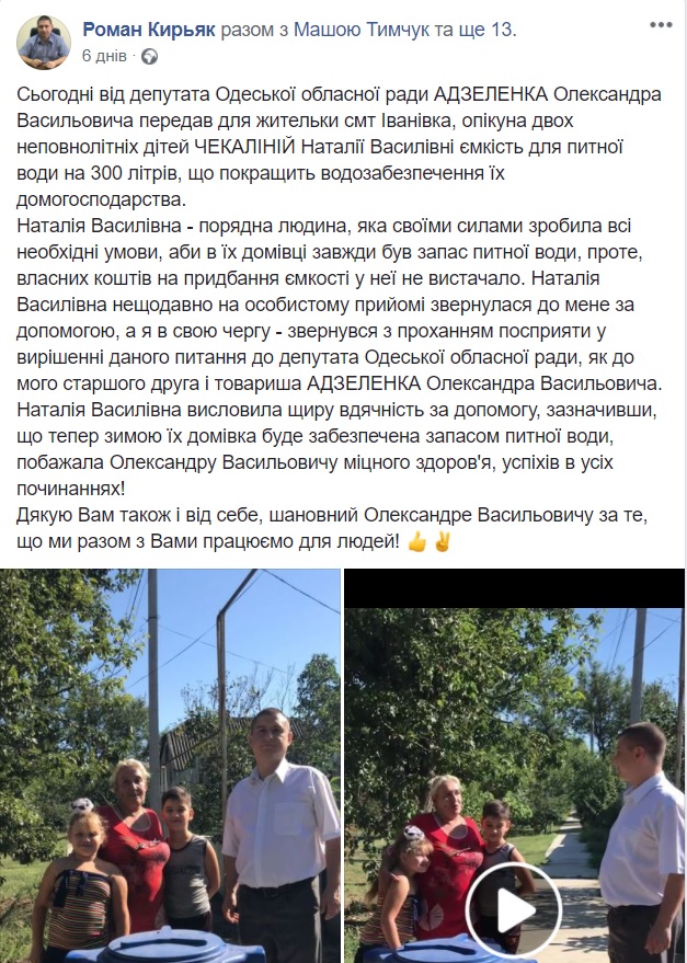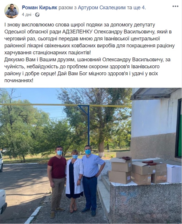 9, 11 і 16 вересня користувач Facebook Роман Кір’як опублікував дописи про благодійну допомогу від депутата Одеської обласної ради Олександра Адзеленка: ємкість для питної води на 300 літрів для опікунки двох неповнолітніх дітей, ковбасні вироби і огірки для Іванівської центральної районної лікарні. На сторінці цього користувача зазначено, що він є головою Іванівської РДА. Згідно з інформацією офіційного сайту Іванівської РДА, її очолю Роман Кір’як.