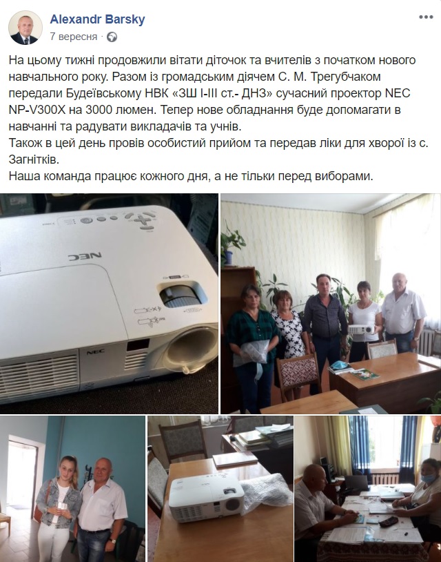 7 вересня на сторінці депутата Одеської обласної ради у Facebook Олександра Барського оприлюднена публікація, в якій зазначено, що він подарував новий проєктор Будеївському навчально-виховному комплексу. Також у публікації сказано, що Олександр Барський пізніше провів прийом громадян і передав ліки для хворої жительки села Загнітків.