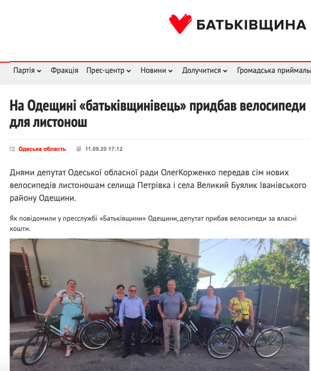 11 вересня на сайті ВО «Батьківщина» опублікували новину про те, що депутат Одеської обласної ради Олег Корженко придбав сім велосипедів для листонош селища Петрівка і села Великий Буялик Іванівського району.