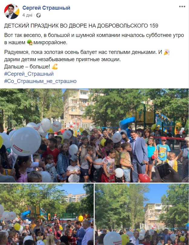 4 вересня на сторінці депутата Одеської міської ради у Facebook Сергія Страшного оприлюднили пост про дитяче свято. У відеоролику зазначено, що дитяче свято організоване Сергієм Страшним та ще одним потенційним кандидатом, депутатом Одеської обласної ради Олександром Ахмеровим. Дітей розважали аніматори, їх пригощали морозивом.