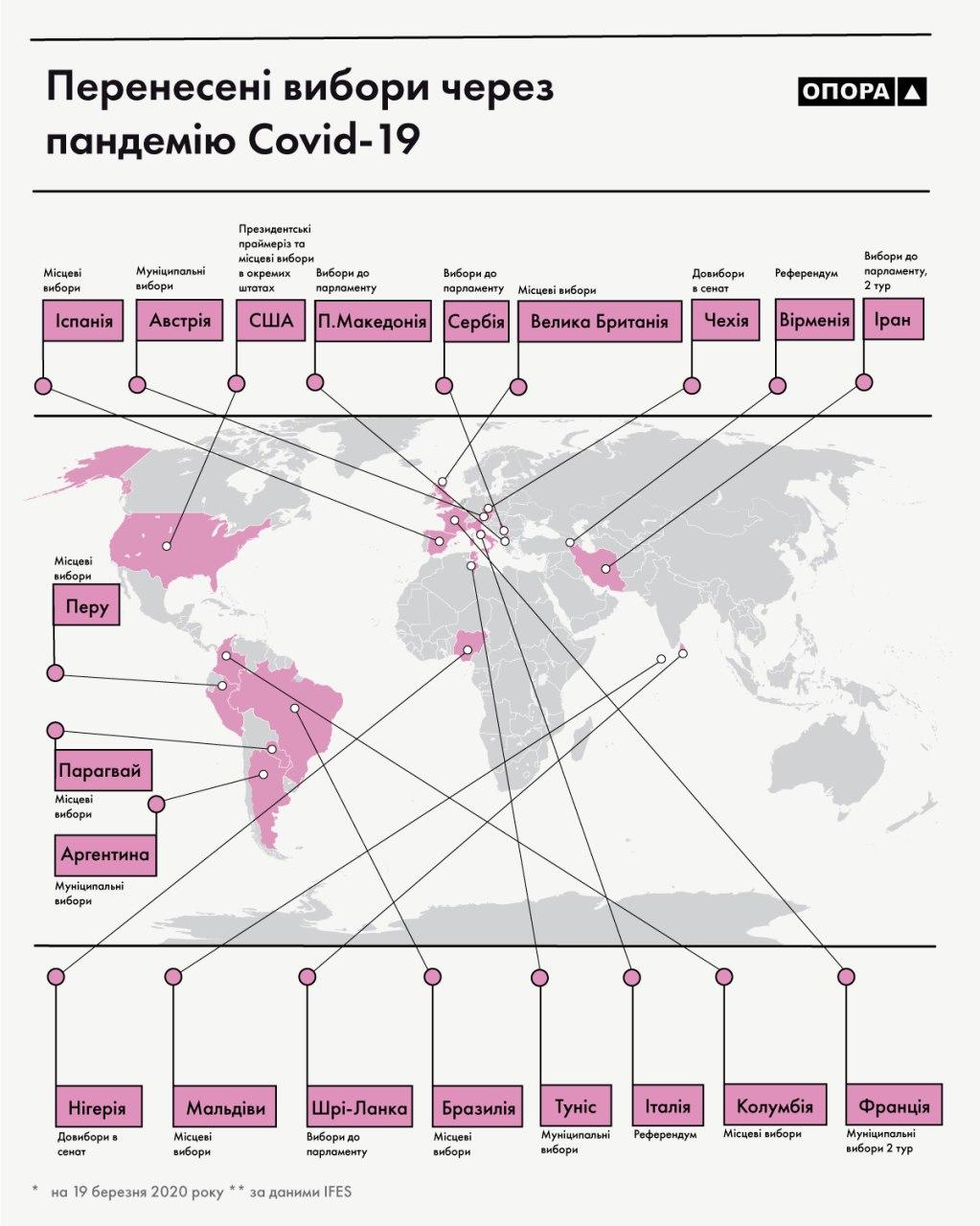 Ще у березні чимало країн у світі відмовилися від проведення виборів, серед них Іспанія, Велика Британія, Перу, Парагвай, Мальдіви, Бразилія та Колумбія. У цих країнах мали провести місцеві вибори. Також перенесли муніципальні вибори в Австрії, Аргентині, Тунісі, та Франція (2 тур). У Сполучених Штатах Америки, які наразі є лідером серед країн, де зареєстрована найбільша кількість інфікованих коронавірусом, перенесли праймеріз президентських виборів та місцеві вибори в окремих штатах.