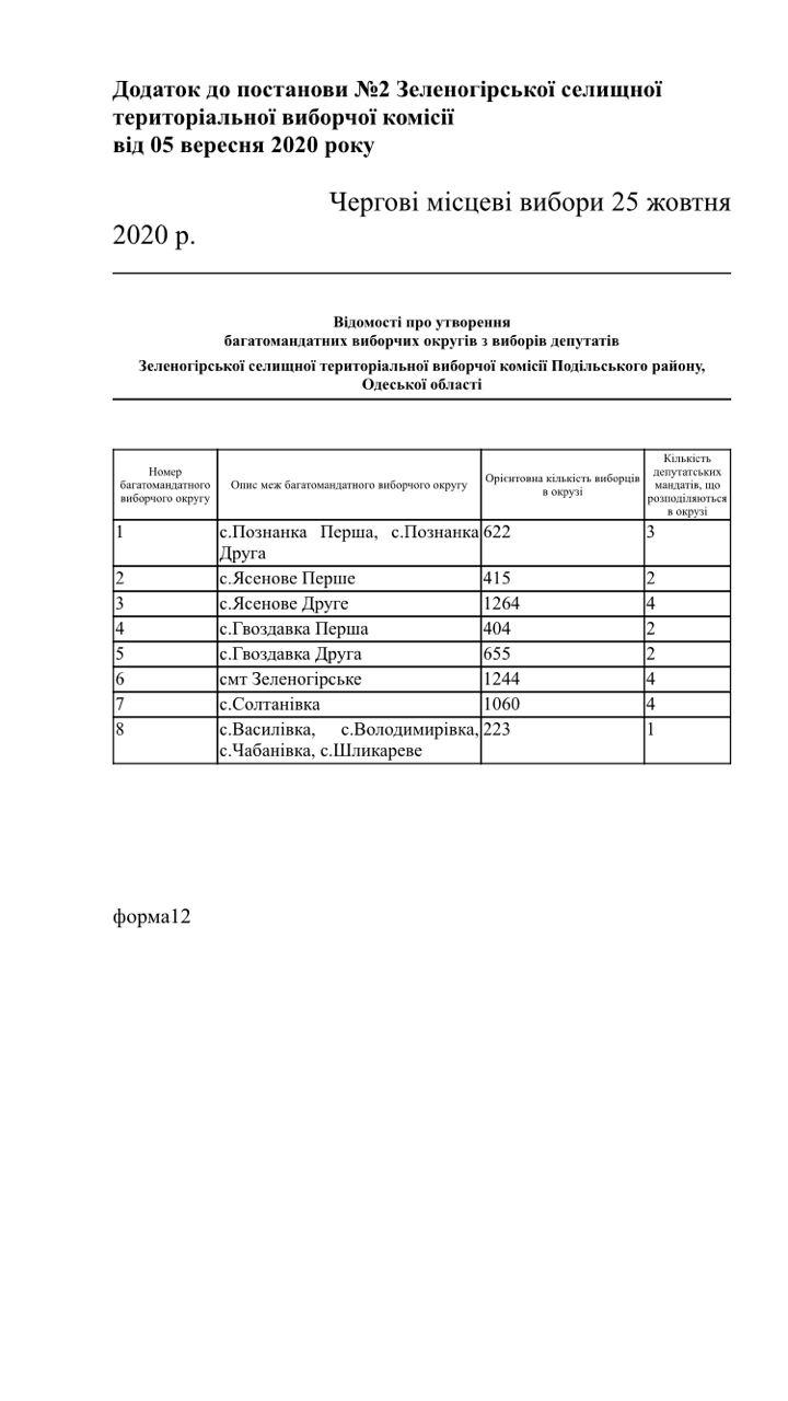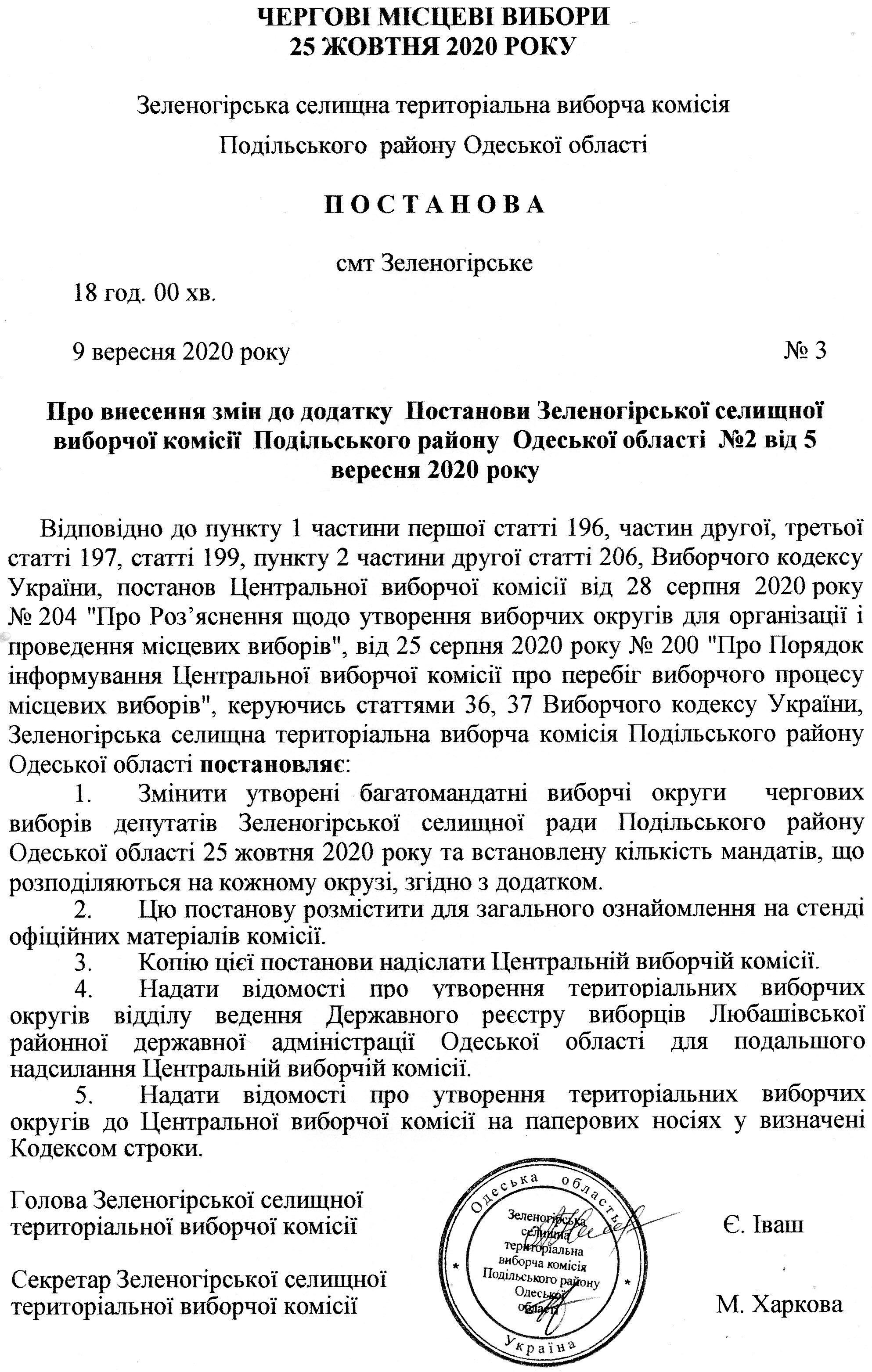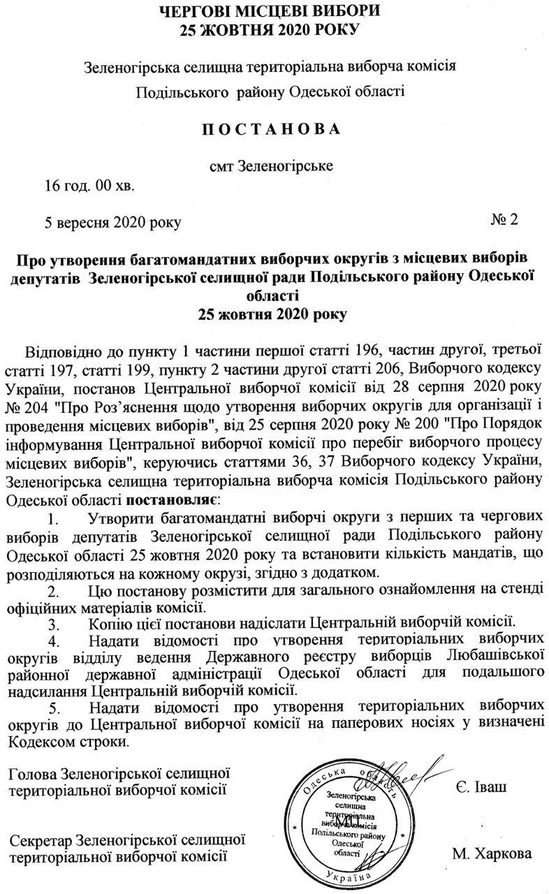 Зеленогірська ТВК прийняла постанову №2 про утворення багатомандатних виборчих округів вчасно, 5 вересня, однак, як повідомляє спостерігач ОПОРИ, після завершення засідання комісія помітила помилку у додатку до постанови: невідповідність кількості мандатів кількості виборців. Того ж дня члени комісії провели ще одне засідання, на якому прийняли нове рішення про утворення багатомандатних виборчих округів, однак оформили його також постановою №2, із зазначенням часу прийняття – 16:00. У цій постанові ТВК змінила назву, а також кількість мандатів, які розподіляються у двох багатомандатних виборчих округах. Нова постанова №2 має назву «Про утворення багатомандатних виборчих округів з місцевих виборів депутатів Зеленогірської селищної ради Подільського району Одеської області». У ній встановлена кількість мандатів, які розподіляються в окрузі №1 (2 мандати) і в окрузі №5 (3 мандати). Кількість мандатів, які розподіляються в інших багатомандатних виборчих округах, залишилась без змін.