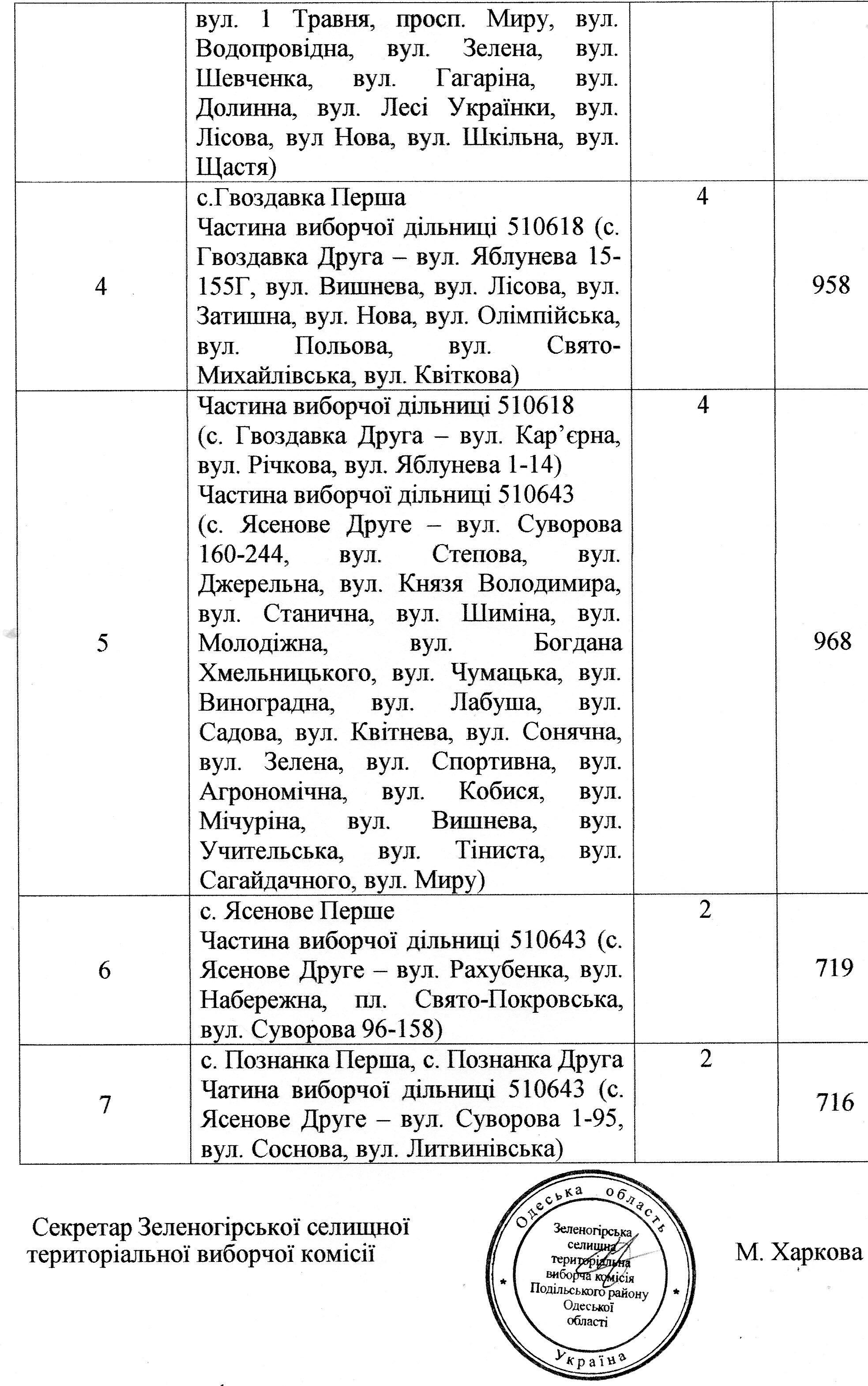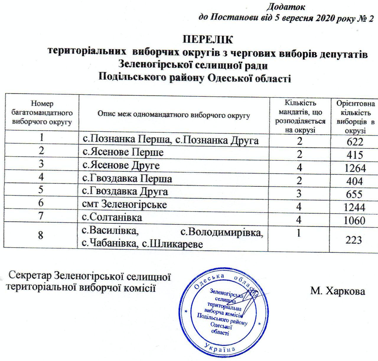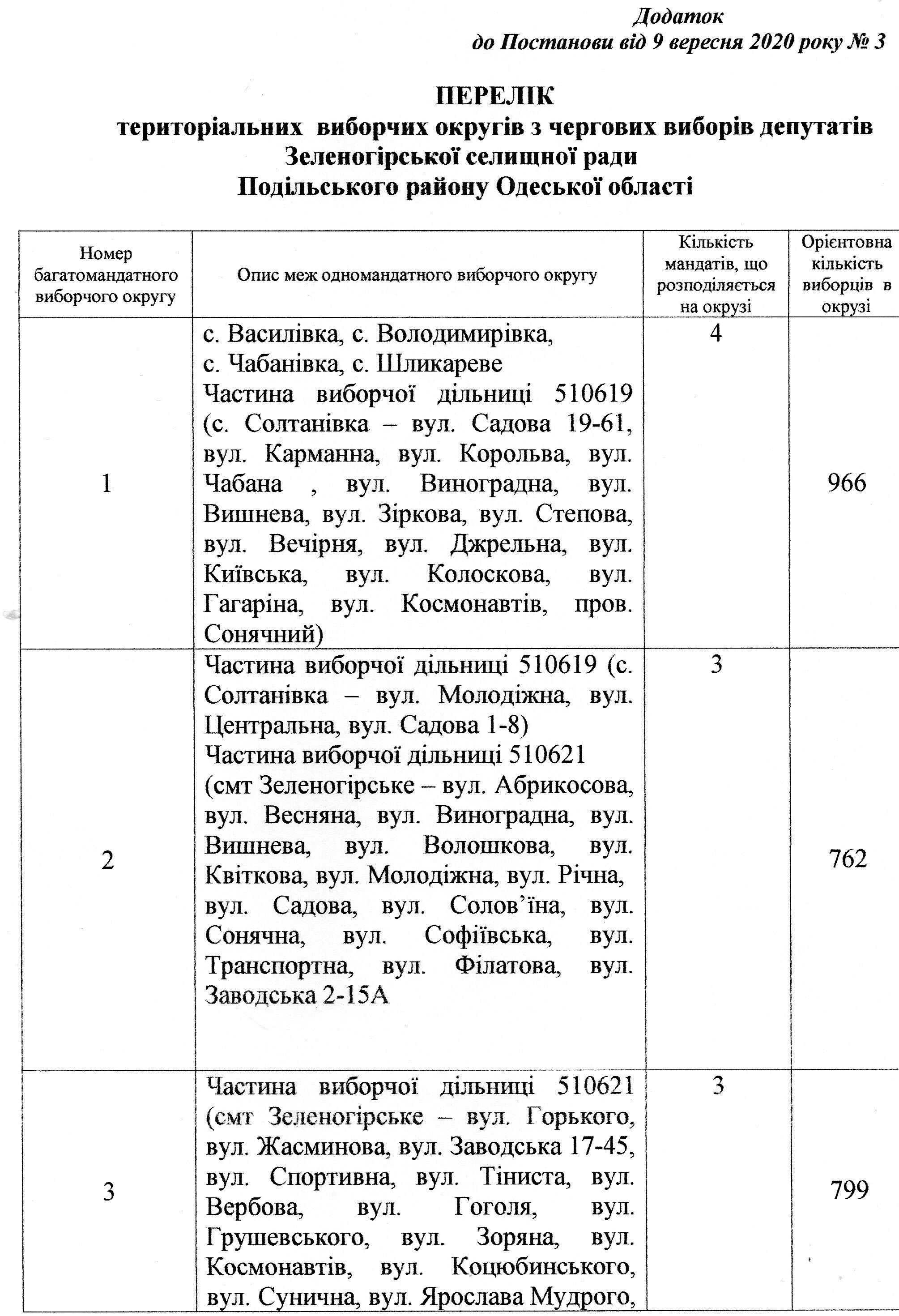 Зеленогірська ТВК прийняла постанову №2 про утворення багатомандатних виборчих округів вчасно, 5 вересня, однак, як повідомляє спостерігач ОПОРИ, після завершення засідання комісія помітила помилку у додатку до постанови: невідповідність кількості мандатів кількості виборців. Того ж дня члени комісії провели ще одне засідання, на якому прийняли нове рішення про утворення багатомандатних виборчих округів, однак оформили його також постановою №2, із зазначенням часу прийняття – 16:00. У цій постанові ТВК змінила назву, а також кількість мандатів, які розподіляються у двох багатомандатних виборчих округах. Нова постанова №2 має назву «Про утворення багатомандатних виборчих округів з місцевих виборів депутатів Зеленогірської селищної ради Подільського району Одеської області». У ній встановлена кількість мандатів, які розподіляються в окрузі №1 (2 мандати) і в окрузі №5 (3 мандати). Кількість мандатів, які розподіляються в інших багатомандатних виборчих округах, залишилась без змін.