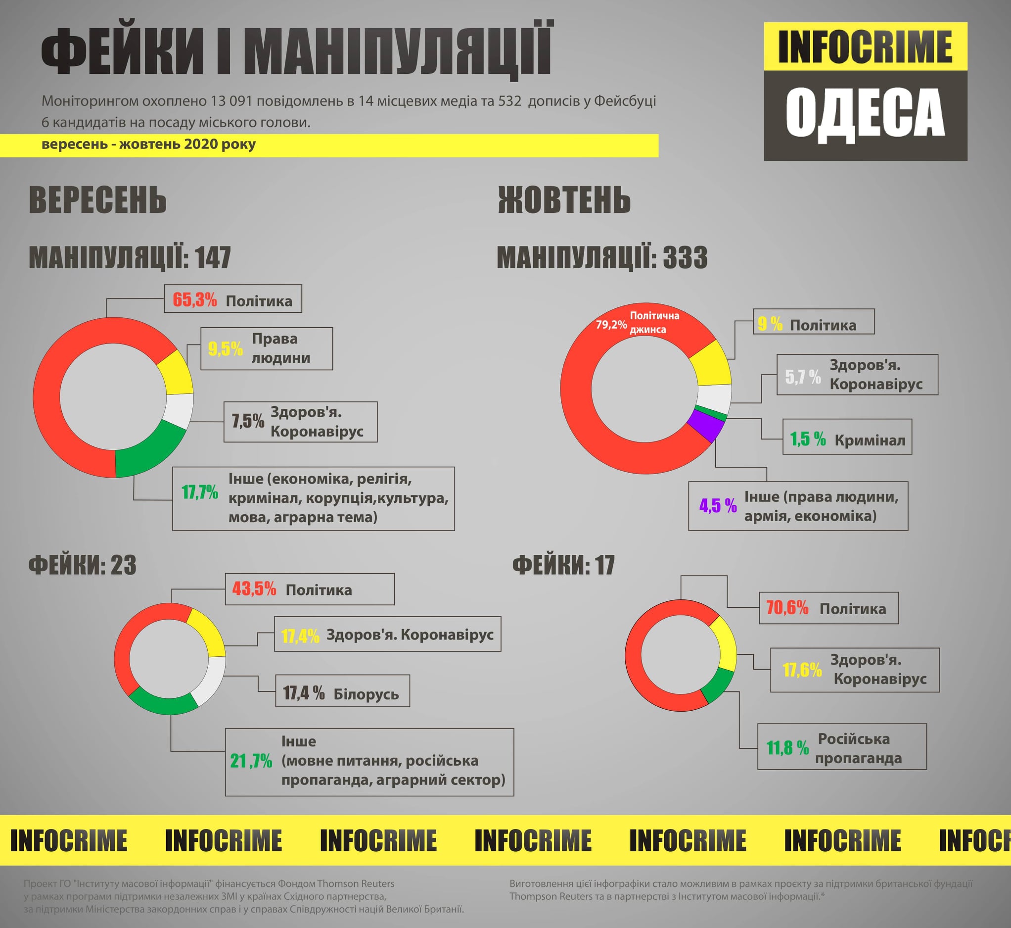 За період вересень-жовтень по Одеському регіону аналітики проєкту Infocrime Одеса проаналізували 13 тисяч 91 новину в 14 медіа та 532 дописи шести кандидатів на посаду міського голови.