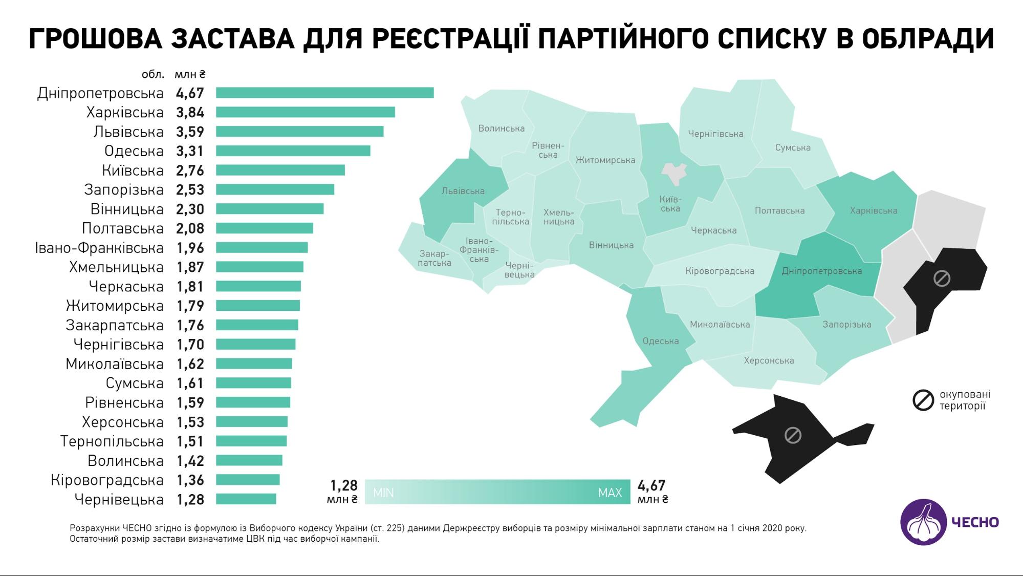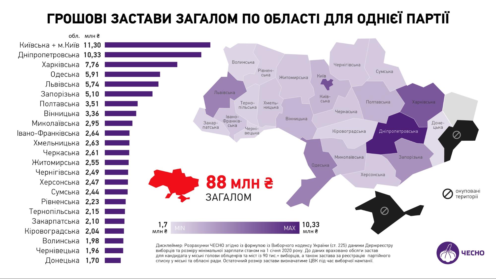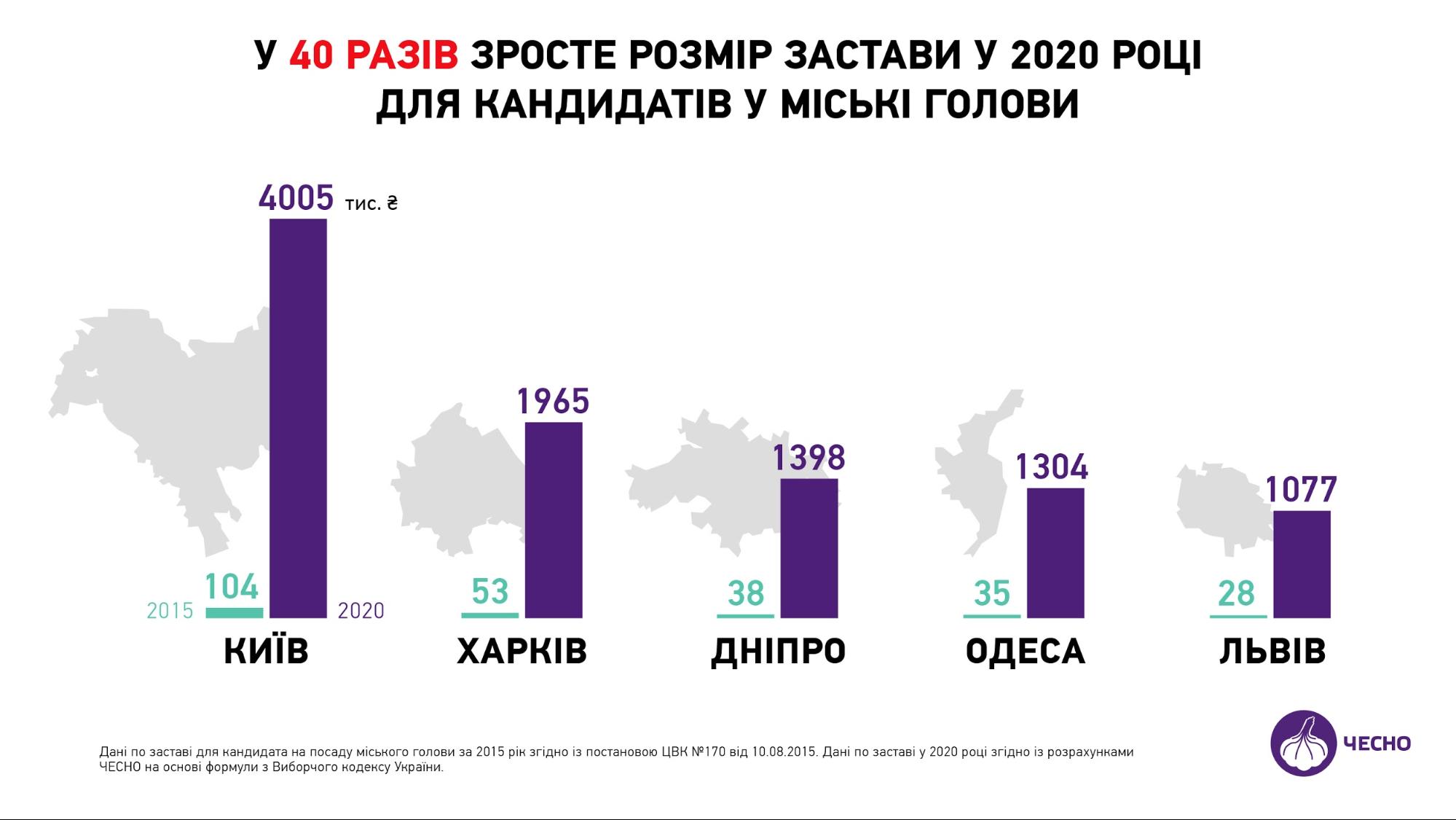 Як повідомляють аналітики громадського руху ЧЕСНО, якщо суттєвих змін у розмірах застав кандидатів у президенти та до парламенту не відбулося, то заставу у місцеві ради підняли майже в 40 разів у порівнянні із місцевою кампанією 2015 року.
