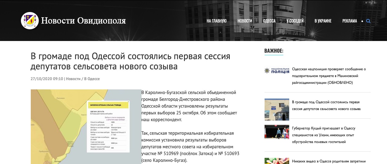 Як інформує видання «Новини Овідіополя», у Кароліно-Бугазькій сільській об'єднаній громаді Білгород-Дністровського району Одеської області 27 жовтня сільська територіальна виборча комісія встановила результати виборів депутатів місцевої ради на виборчій дільниці № 510969 (селище Затока) і № 510693 (село Кароліно-Бугаз). Крім того, за даними цього ж видання, у першій половині дня 27 жовтня відбулася перша сесія Кароліно-Бугазькій сільської ради, на якій кандидат на посаду сільського голови Андрій Апанасенко і кандидати в депутати сільської ради прийняли присяги та «розглянули ряд робочих питань».