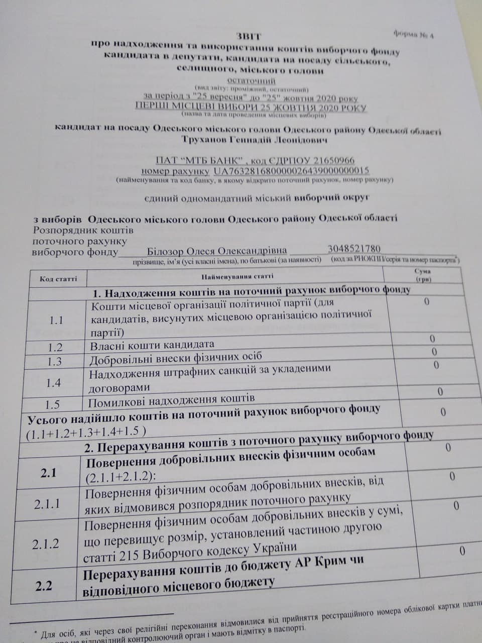 Обраний мером Одеси Геннадій Труханов відзвітував про свої трати під час виборів, хоча його звіт не оприлюднено на сайті, але у проміжному звіті, який є у розпорядженні ІзбірКому, вказано, що жодних коштів з виборчого фонду не витрачено, та й взагалі коштів туди не надходило. Фінальний звіт екскандидата також не оприлюднено.