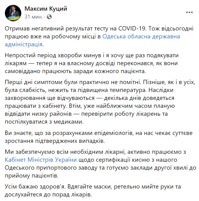 Керівник Одеської обласної адміністрації Максим Куций отримав негативний результат тесту на COVID-19 та відсьогодні, 20 жовтня, працює вже на робочому місці.