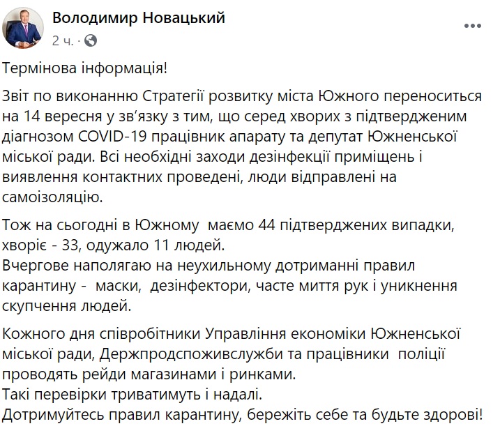 Міський голова Южного відклав звіт про виконання Стратегії розвитку міста до 14 вересня у зв’язку з тим, що серед хворих з підтвердженим діагнозом COVID-19 виявився працівник апарату та депутат Южненської міської ради.