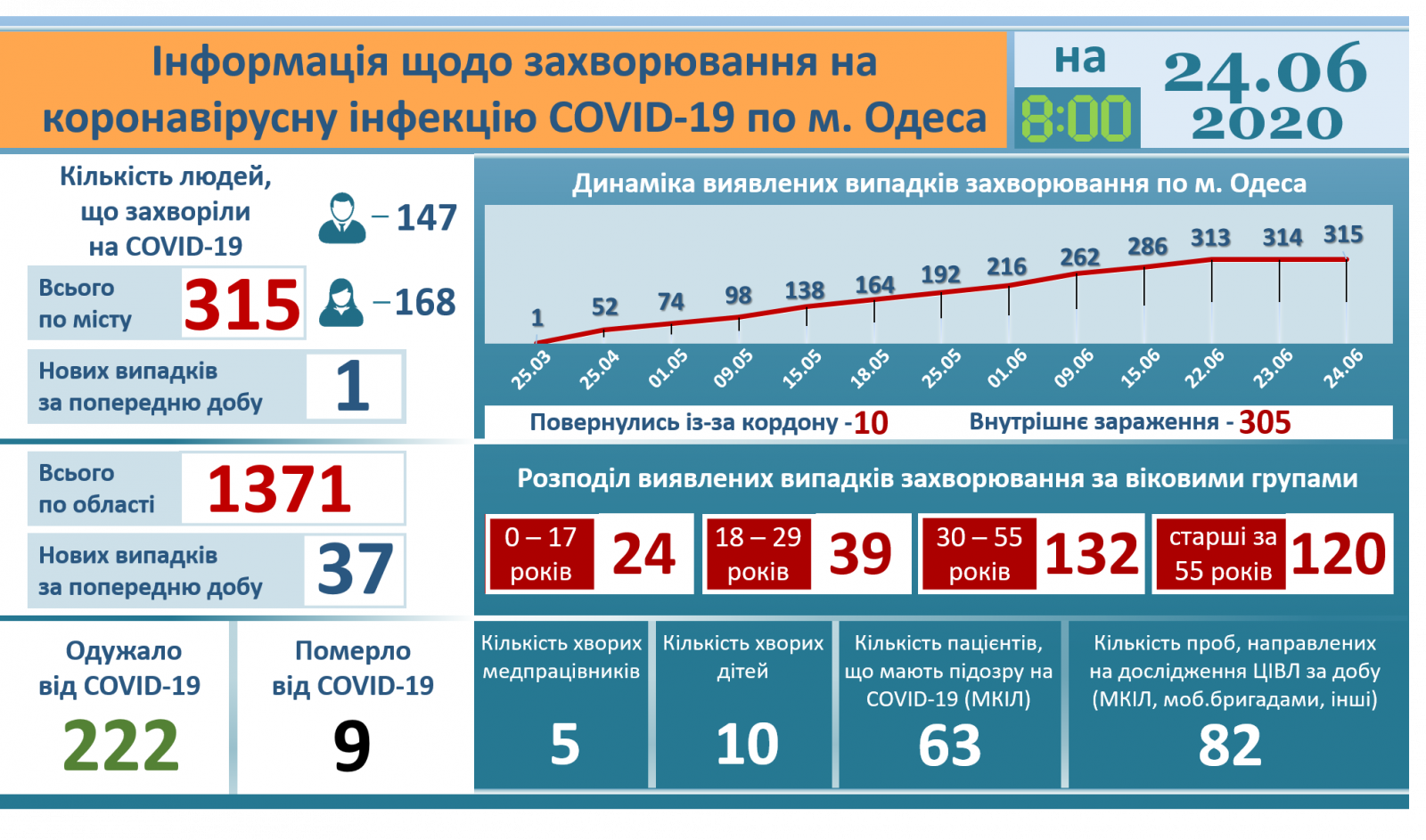 За інформацією Одеського обласного лабораторного центру МОЗ України, на ранок 24 червня в Одеській області лабораторно підтвердився 1371 випадок COVID-19, з яких 315 у жителів Одеси.