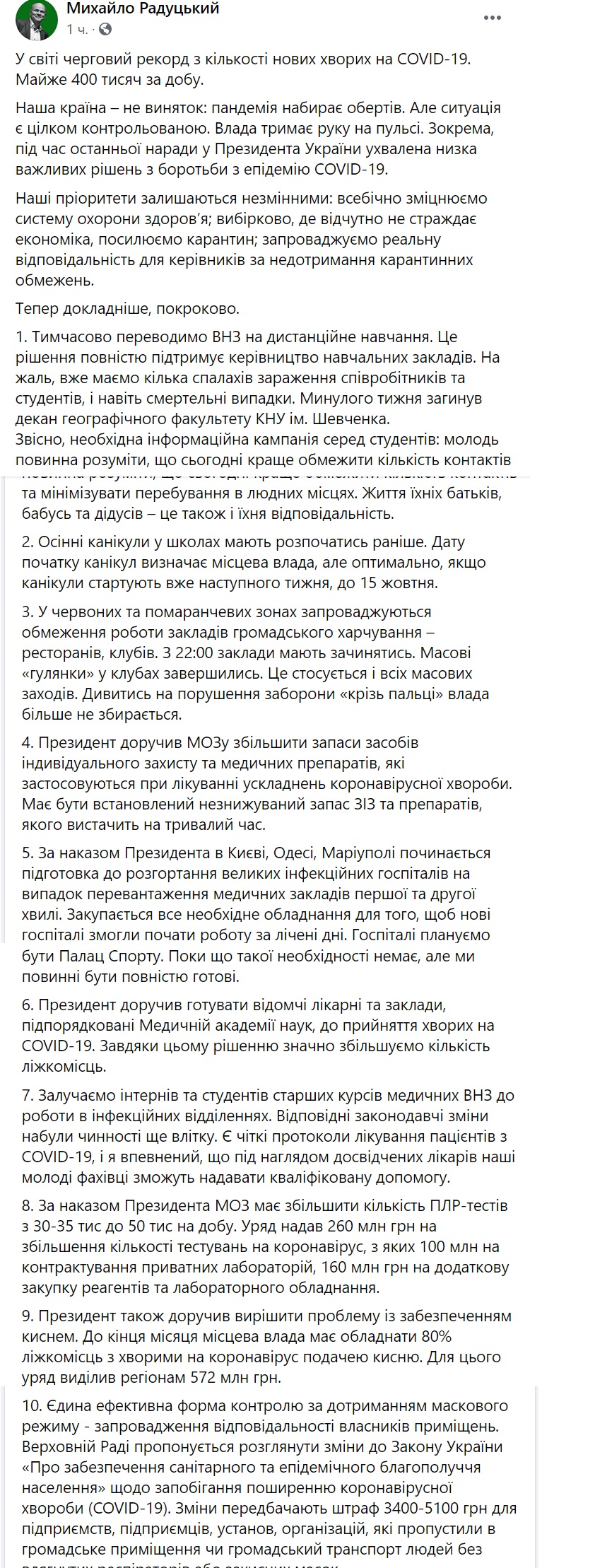 Окрім того, за його словами, після наради с президентом вирішили тимчасово перевести вищі навчальні заклади на дистанційне навчання.