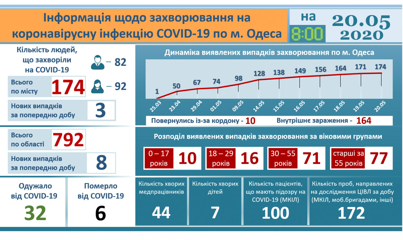 За інформацією Одеського обласного лабораторного центру МОЗ України, на ранок 20 травня, в Одеській області лабораторно підтверджено 792 випадки COVID-19.