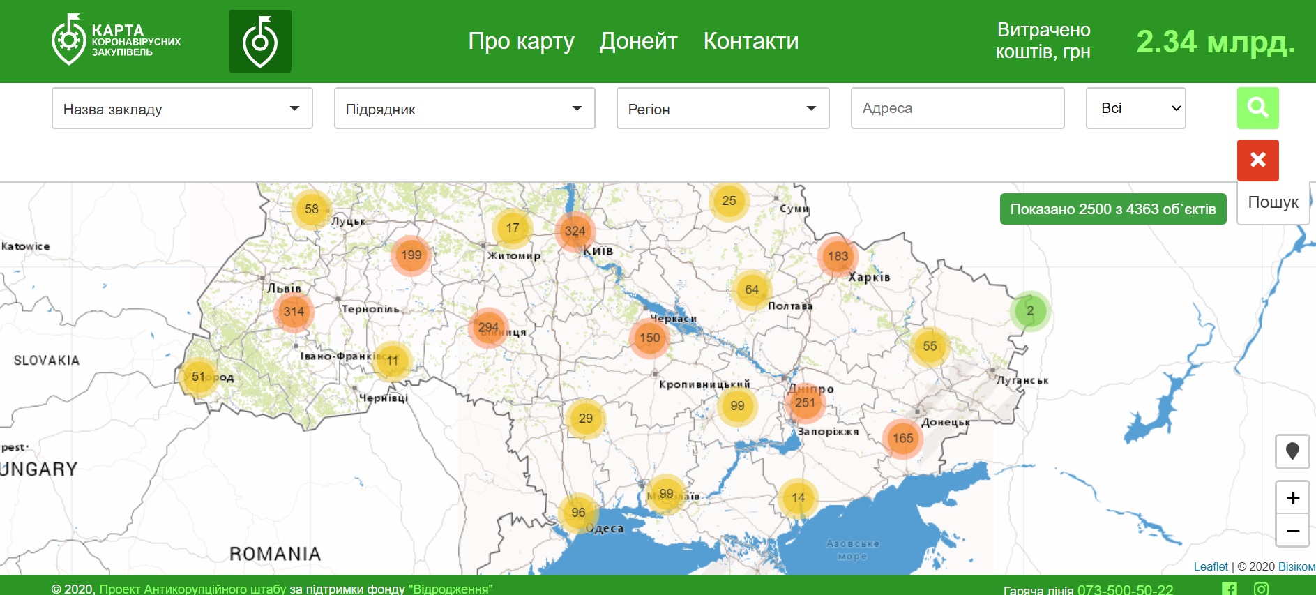 Громадська організація «Антикорупційний штаб» розробила та запустила мапу коронавірусних закупівель — сайт для перевірки витрат бюджетних коштів на боротьбу з коронавірусною інфекцією