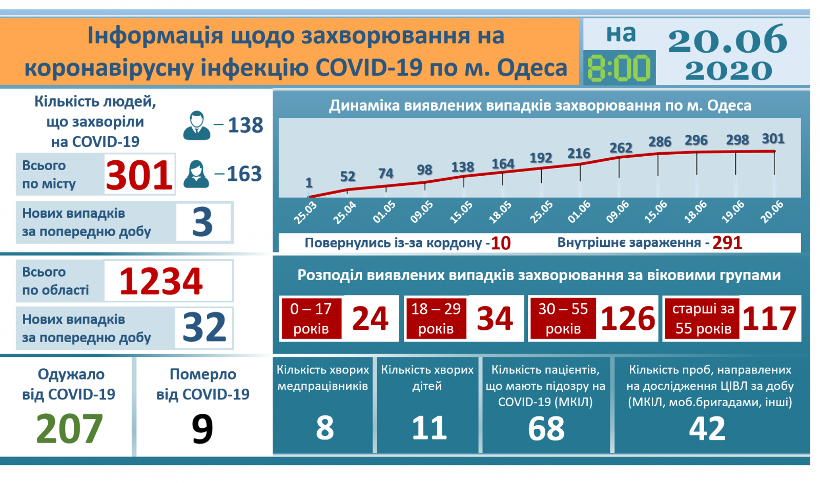 Загалом з початку пандемії коронавірусну інфекцію лабораторно підтвердили у 1 тис. 234 людей, з них 301 осіб - жителі Одеси.