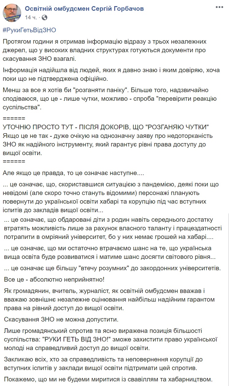 Освітній омбудсмен Сергій Горбачов заявив про те, що, згідно з інформацією, яку він отримав з декількох не пов'язаних між собою джерел, влада має намір взагалі скасувати зовнішнє незалежне оцінювання.