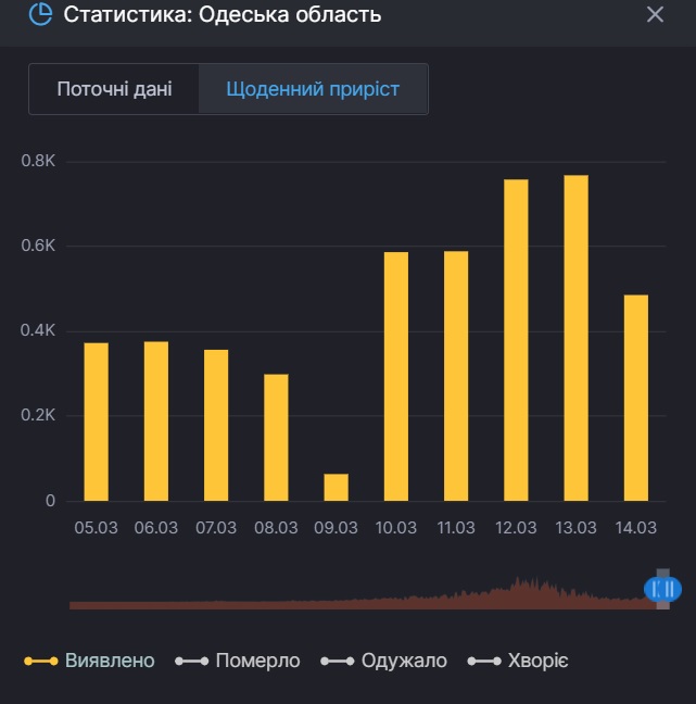 Найбільшу кількість випадків за тиждень в регіоні зареєстрували 12 та 11 березня - 767 та 757 випадків відповідно, а загалом зріст добової кількості випадків інфікування змусив керівництво департаменту охорони здоров'я Одеської обладміністрації та головного санітарного лікаря Одеської області говорити про можливість віднесення Одеської області до "червоної зони" карантину за тиждень.