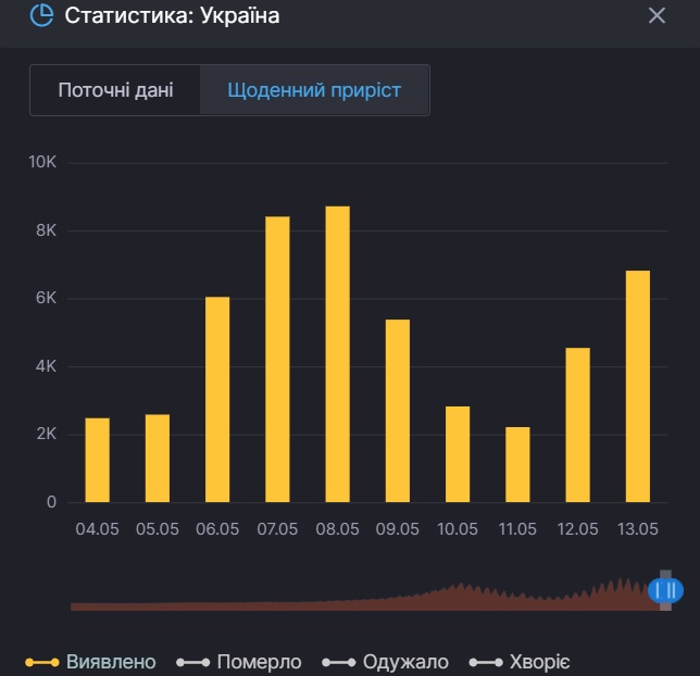 За добу 9 травня Міністерство охорони здоров'я не зафіксувало жодного летального випадку від коронавірусної хвороби. Кількість нових захворювань теж різко впала - з 342 випадків 8 травня до 83 9 травня.