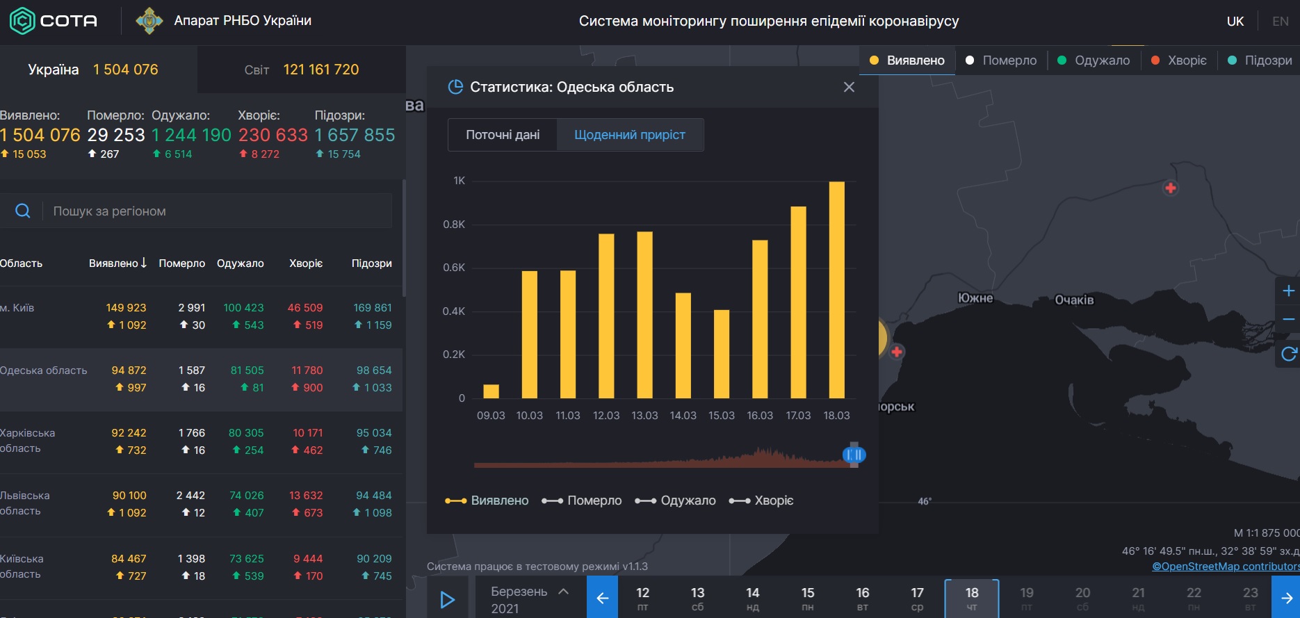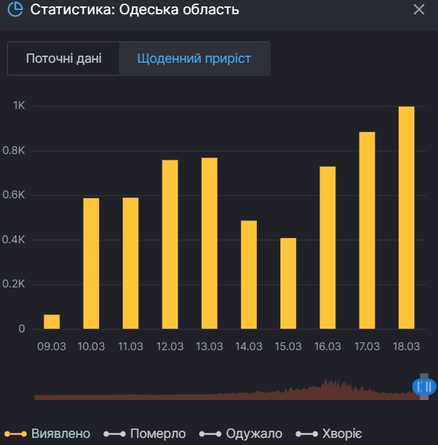 Міністерство охорони здоров'я знов зафіксувало в Одеській області новий антирекорд із захворювання на COVID-19 з початку року - 997 випадки за добу 17 березня, а нових летальних випадків зафіксовано 16.