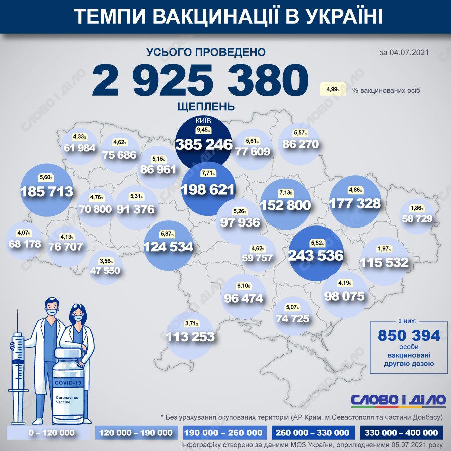 Найбільшу кількість щеплень за 4 липня 2021 року медики здійснили у Харківській області, а за весь період вакцинальної кампанії – у Києві, підрахувало "Слово і Діло".