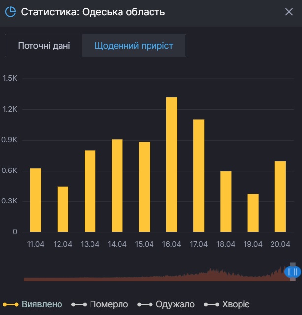 - 623 випадки захворювання на COVID-19 на Одещині за добу 10 квітня, а також відсутність летальних випадків.