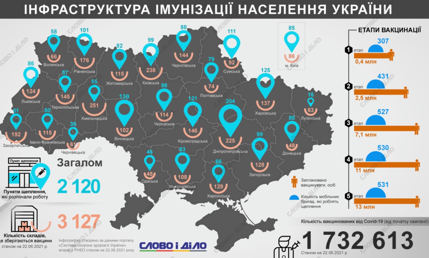 Загалом в Україні працює 2 тисячі 120 пунктів вакцинації, найбільше їх у Дніпропетровській, Вінницькій та Харківській областях – 204, 139 і 125 пунктів відповідно.