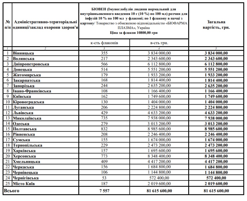 Міністерство охорони здоров’я розподілило в регіони лікарський засіб «Біовен (Імуноглобулін людини нормальний для внутрішньовенного введення 10 г (10 %) по 100 мл)», який використовується під час лікування пацієнтів, хворих на COVID-19.