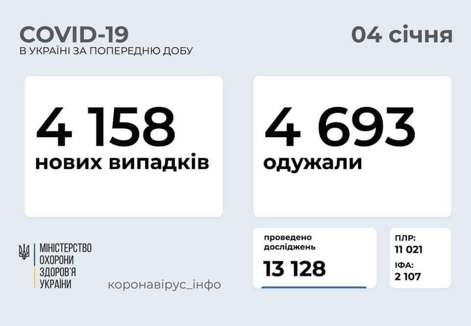 За даними Центру громадського здоров’я, станом на 4 січня в Україні зафіксовано 4 158 нових випадків коронавірусної хвороби. Зокрема, захворіли 170 дітей та 163 медпрацівники. Також за минулу добу в країні госпіталізовано 1 526 осіб; зафіксовано 73 летальних випадки; одужало 4 693 особи; здійснено тестувань за добу – 13 128 (зокрема методом ПЛР – 11 021, методом ІФА – 2 107).