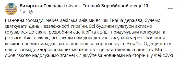 "Через декілька днів ми всі, як і наша держава, будемо святкувати День Незалежності України. Всі будинки культури активно готувалися до свята: розробили сценарії та афіші, придумували конкурси та розваги. Але, нажаль, всі заходи нам доведеться скасувати через зростання кількості нових випадків захворювання на коронавірус в Україні, Одещині та у нашій громаді. Здоров'я наших мешканців - це найголовніша цінність. Ми обов'язково надолужимо згаяне! Слідкуйте за новинами на сторінці у Facebook", - йдеться в повідомлені.