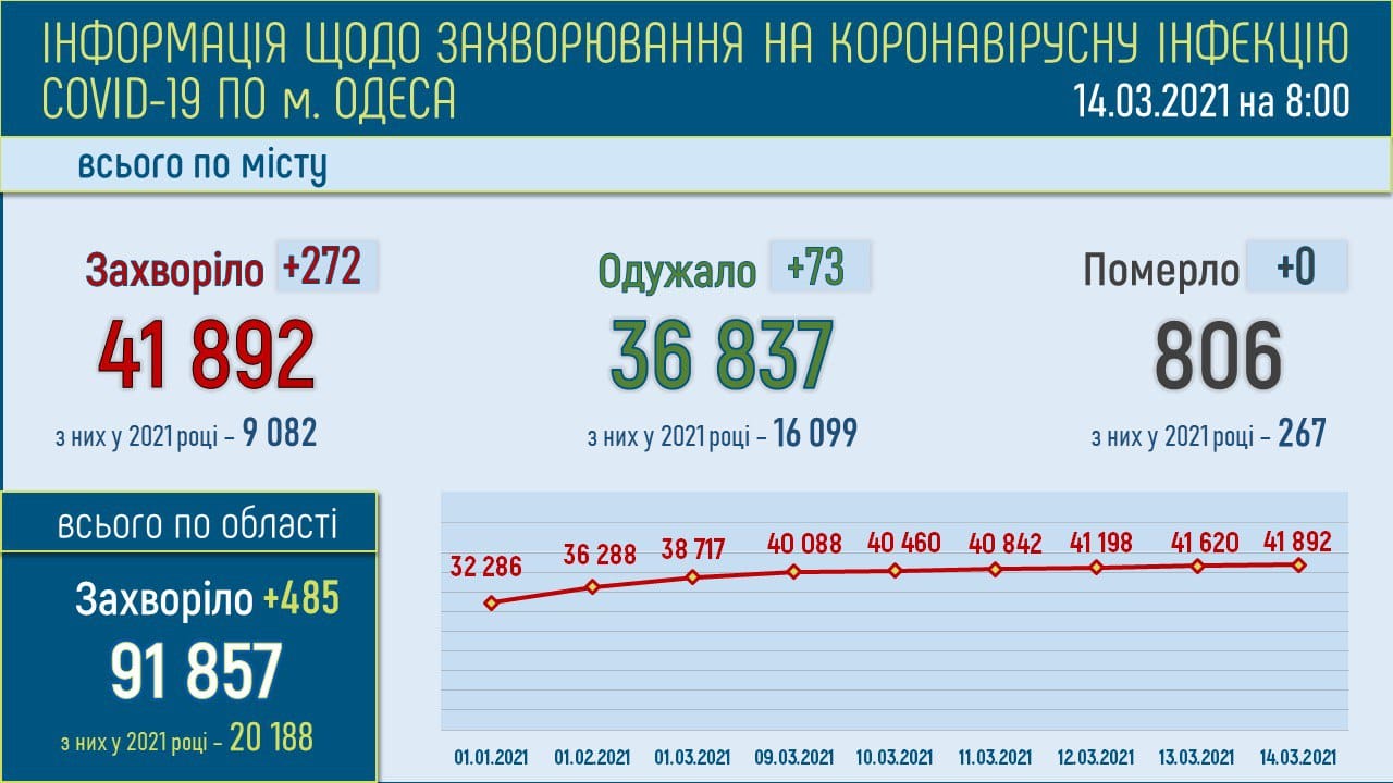 Нагадаємо, Міністерство охорони здоров'я повідомило про 91 тисячу 857 випадків COVID-19, зареєстрованих в Одеській області з початку пандемії, 485 з яких за добу 13 березня.