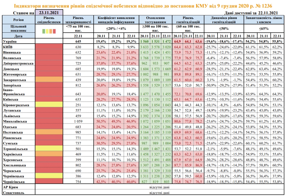 12 тисяч 729 нових випадків COVID-19 зафіксовано в Україні станом на 23 листопада 2021 року. Зокрема, захворіли 1 тис. 58 дітей та 231 медпрацівник. Понад 700 випадків - летальні.